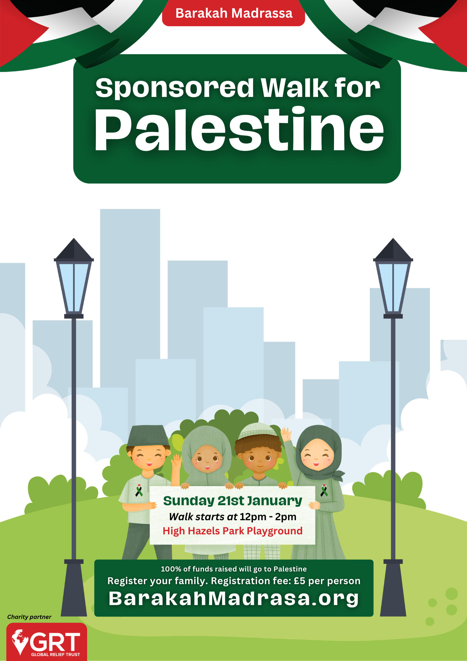 We welcome you to join us for a sponsored Walk for Palestine in High Hazels Park this Sunday 21st January. We will have four stations symbolising four cities and a planned route. Each station will have historical facts, and you will follow a History Hunt learning about Palestine. We will also have snacks and treats available at our four stations. It will be fun, informative family learning experience.£5.00 per person.
