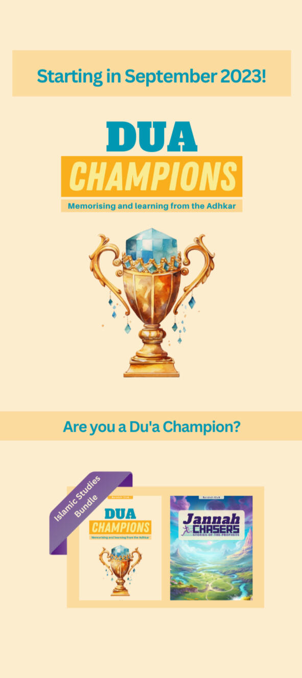 Registration still open. Du’a Champions and Jannah Chasers are focused on the daily du’as and the stories of the prophets These sessions will connect your child to Rasulullah ﷺ, his sunnah, and increase your love for his way, and his teaching. Each session will have a thematic focus, and children will memorise their du’as, in addition to learning about important concepts such as forgiveness, resilience, righteousness and steadfastness.Starting in September 2023!£10 for two sessions a month
